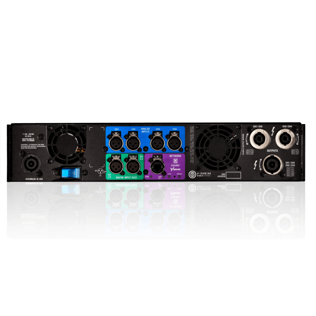 The only tour sound amplifier that provides four routable inputs to any output (analog,AES,VDrive,or CobraNet)