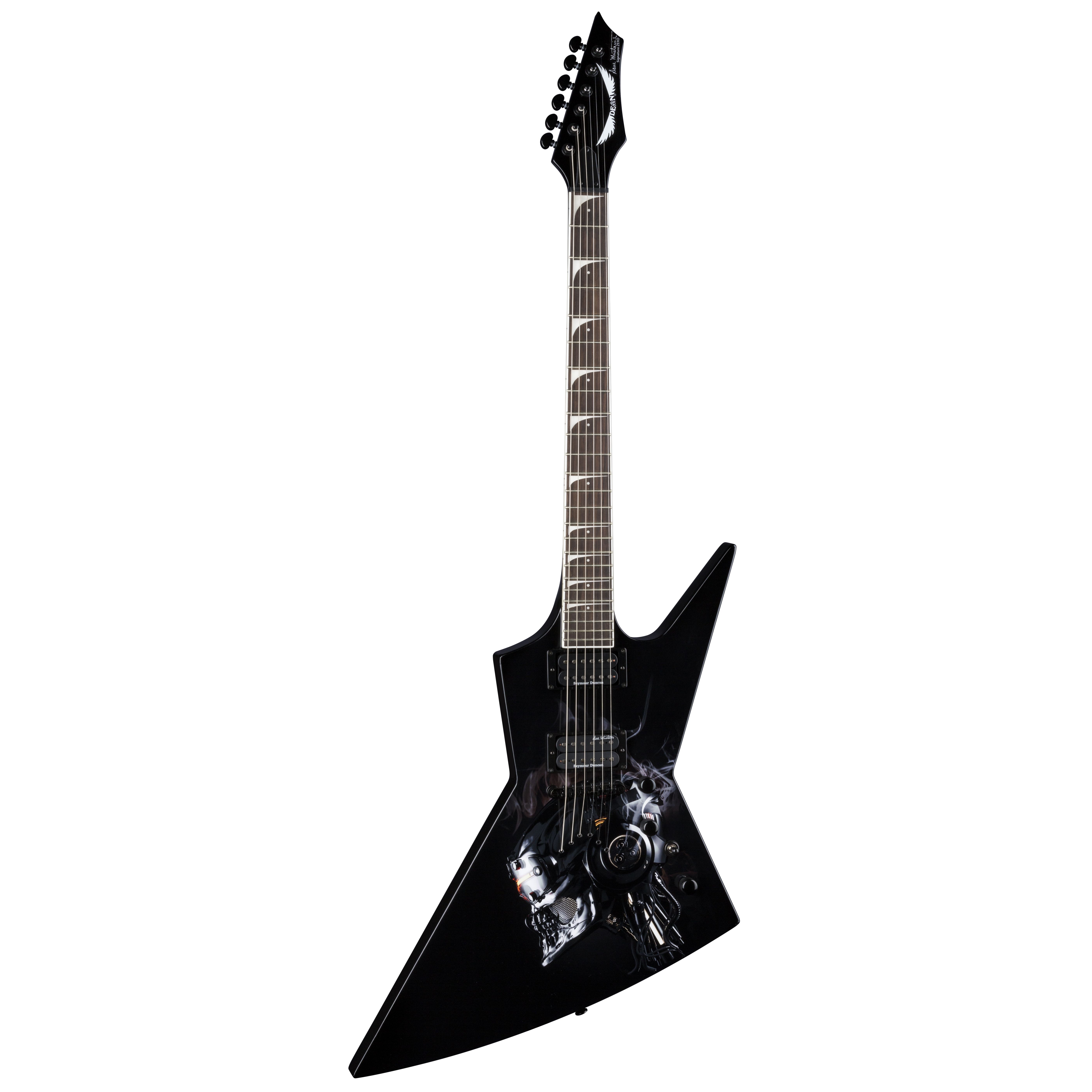 A must-have for any true Megadeth fan! This guitar features a solid Mahogany body and neck and Rosewood fingerboard. The Seymour Duncan pickups scream heavy-metal-shred while the contours of the guitar give easy, comfortable access to all 24 frets! This axe also comes with a bold, custom “Vic Rattlehead” graphic representing Megadeth's main mascot! This axe comes loaded a with screaming Dave Mustaine "Thrash Factor" Seymour Duncan bridge pickup and custom 59 neck humbucker, tune-o-matic bridge and Grover tuners for the ultimate onstage performance. Black hardware comes standard. Get your wings today!