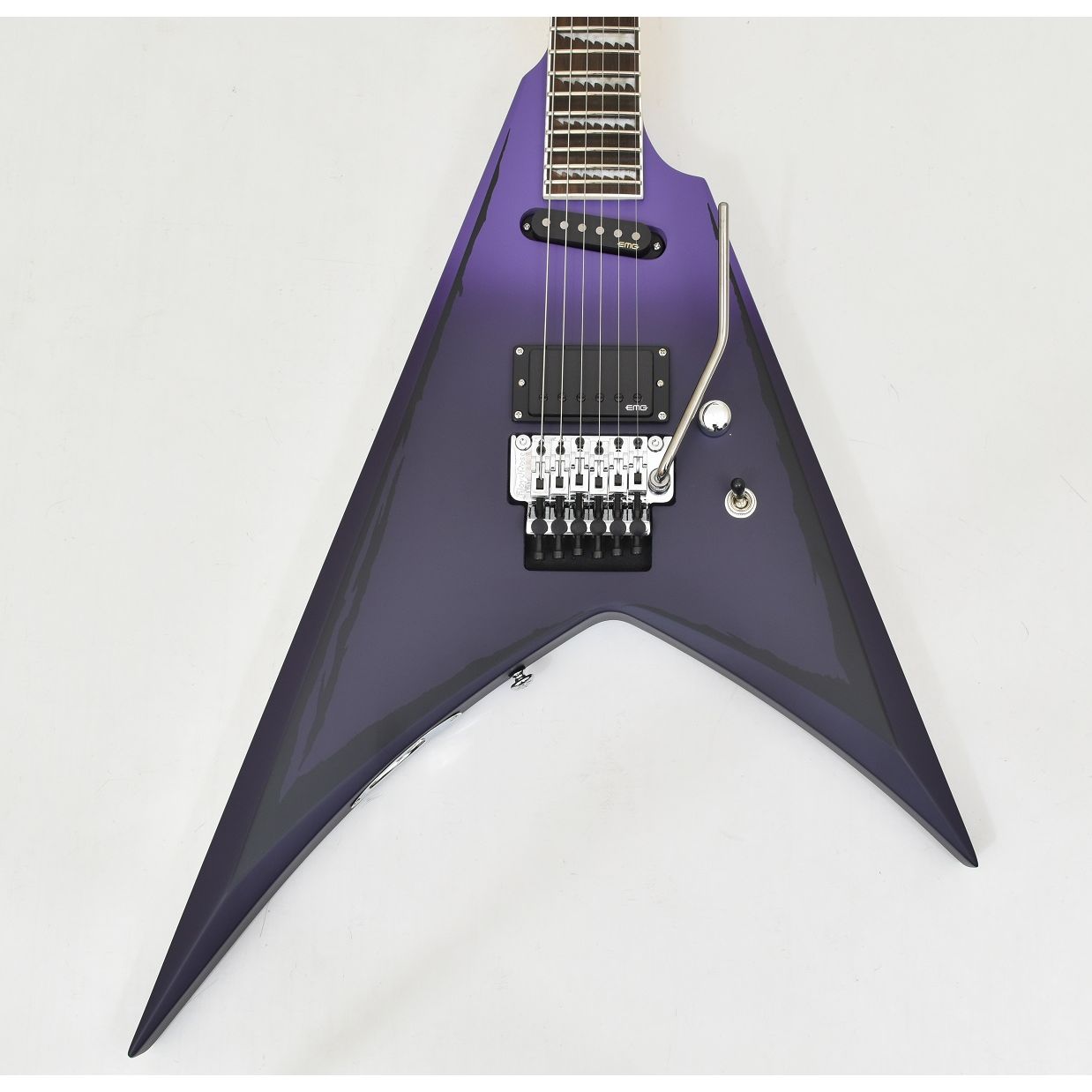 The Alexi Ripped is the first Alexi Laiho signature guitar with multiple pickups: an EMG HZ F-H2 humbucker in the bridge for high-gain punch and an EMG HZ S2 stacked single coil in the neck for mid-rich clarity. Other premium components include Grover tuners, double-locking Floyd Rose 1000 bridge, and chrome hardware with volume control and inset three-way pickup selector. The guitar comes in striking Purple Fade Satin with “ripped” black pinstripes and includes the V-Alexi Guitar Form-Fit ESP hardshell case.