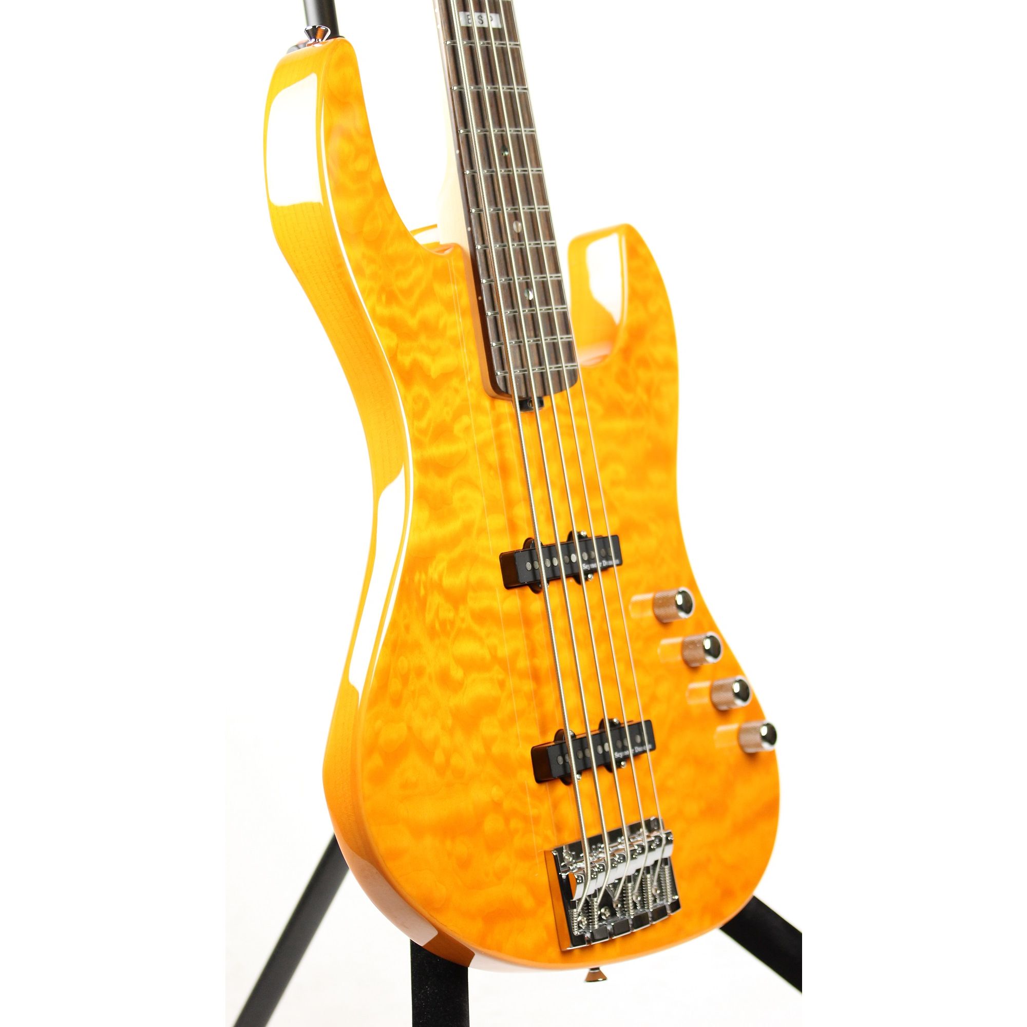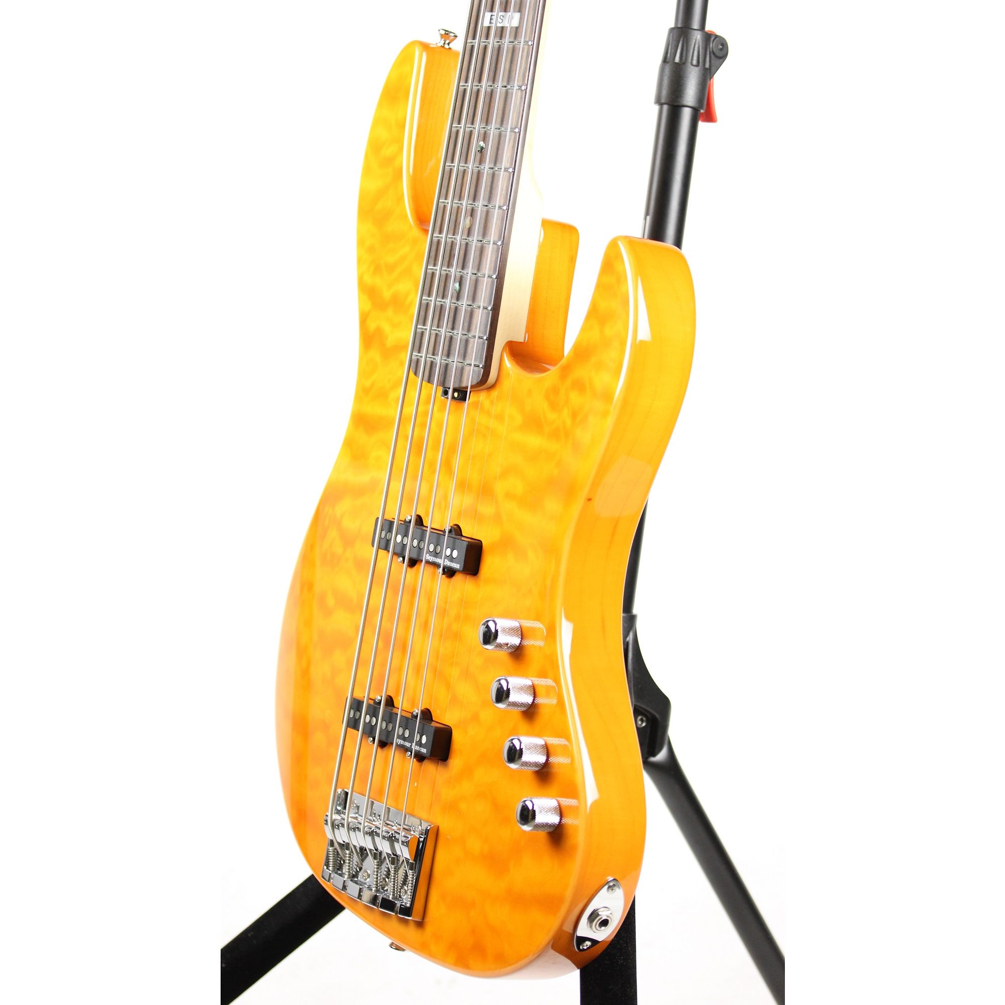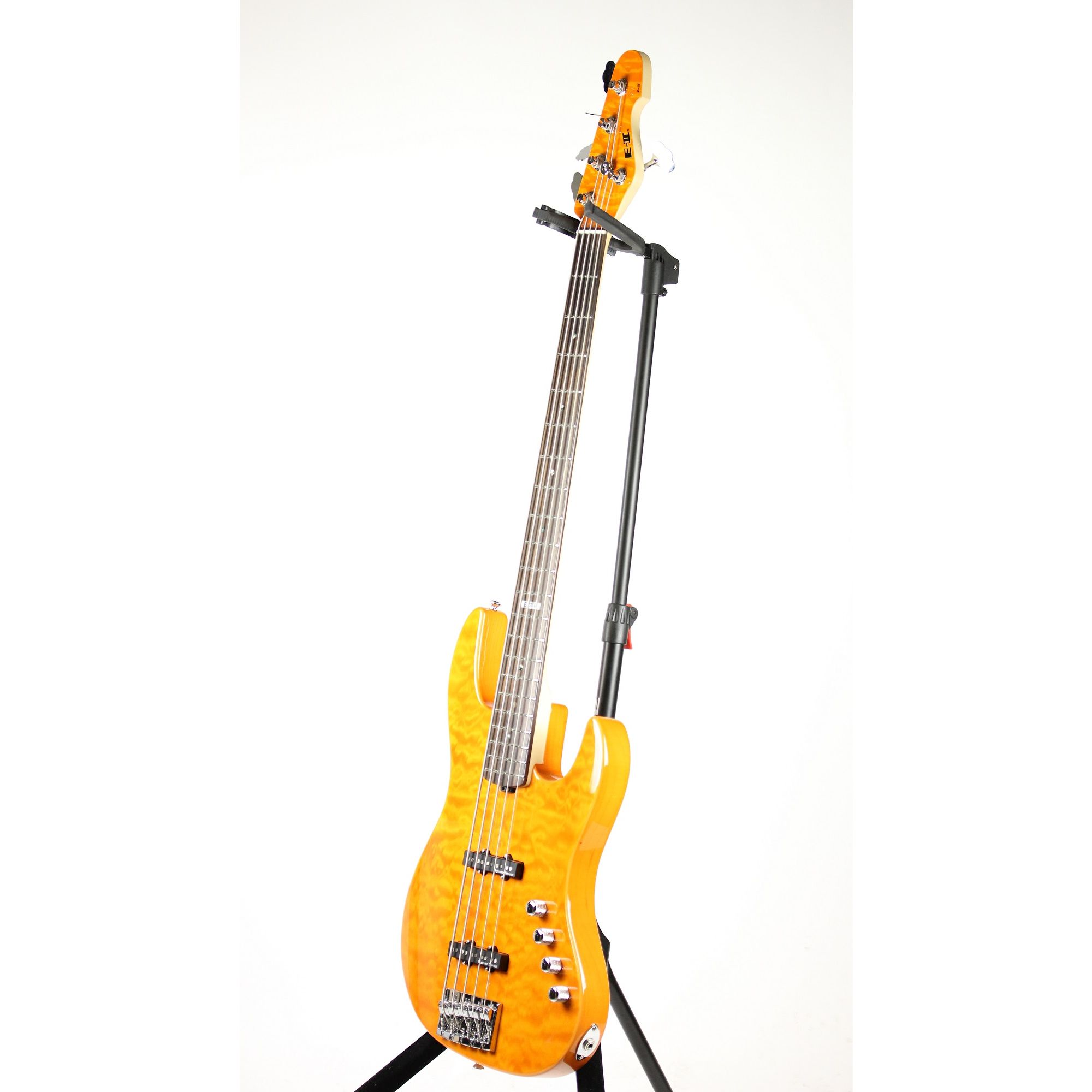 The new ESP E-II J-5 QM Quilted Maple Amber Bass Guitar features: