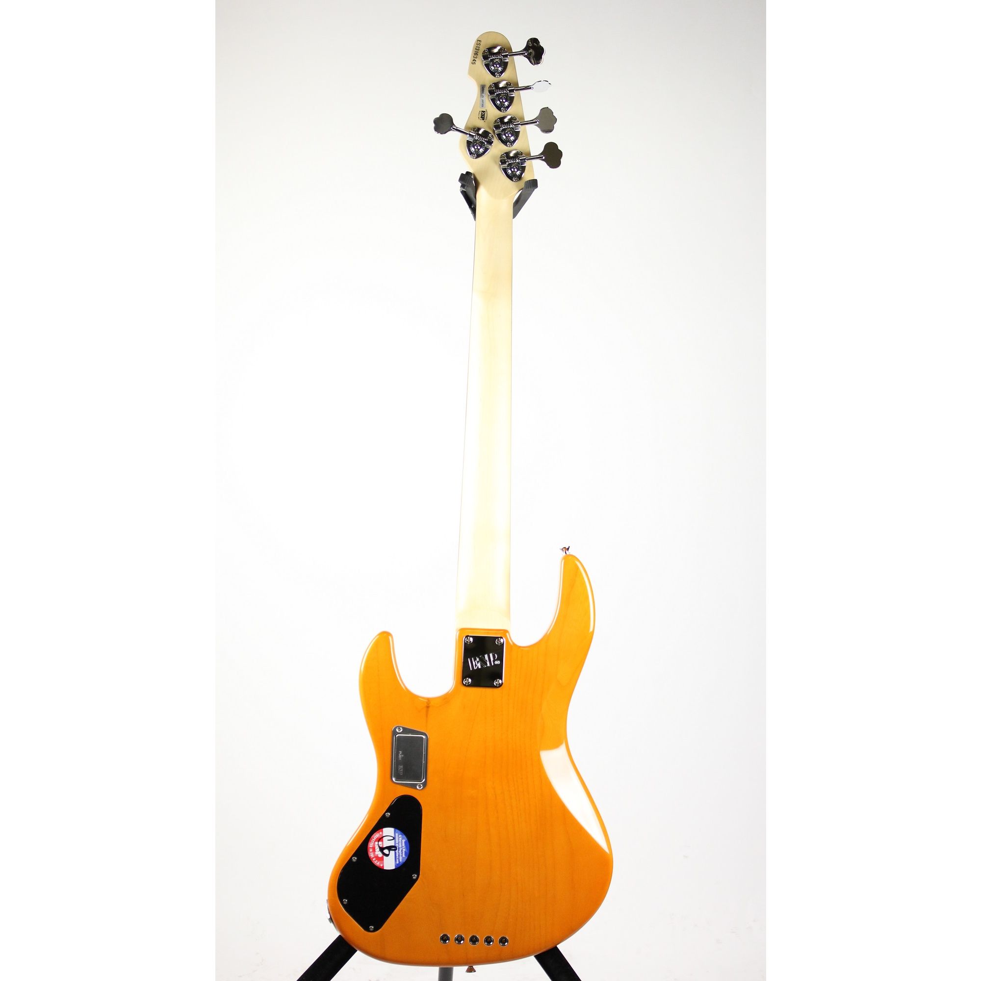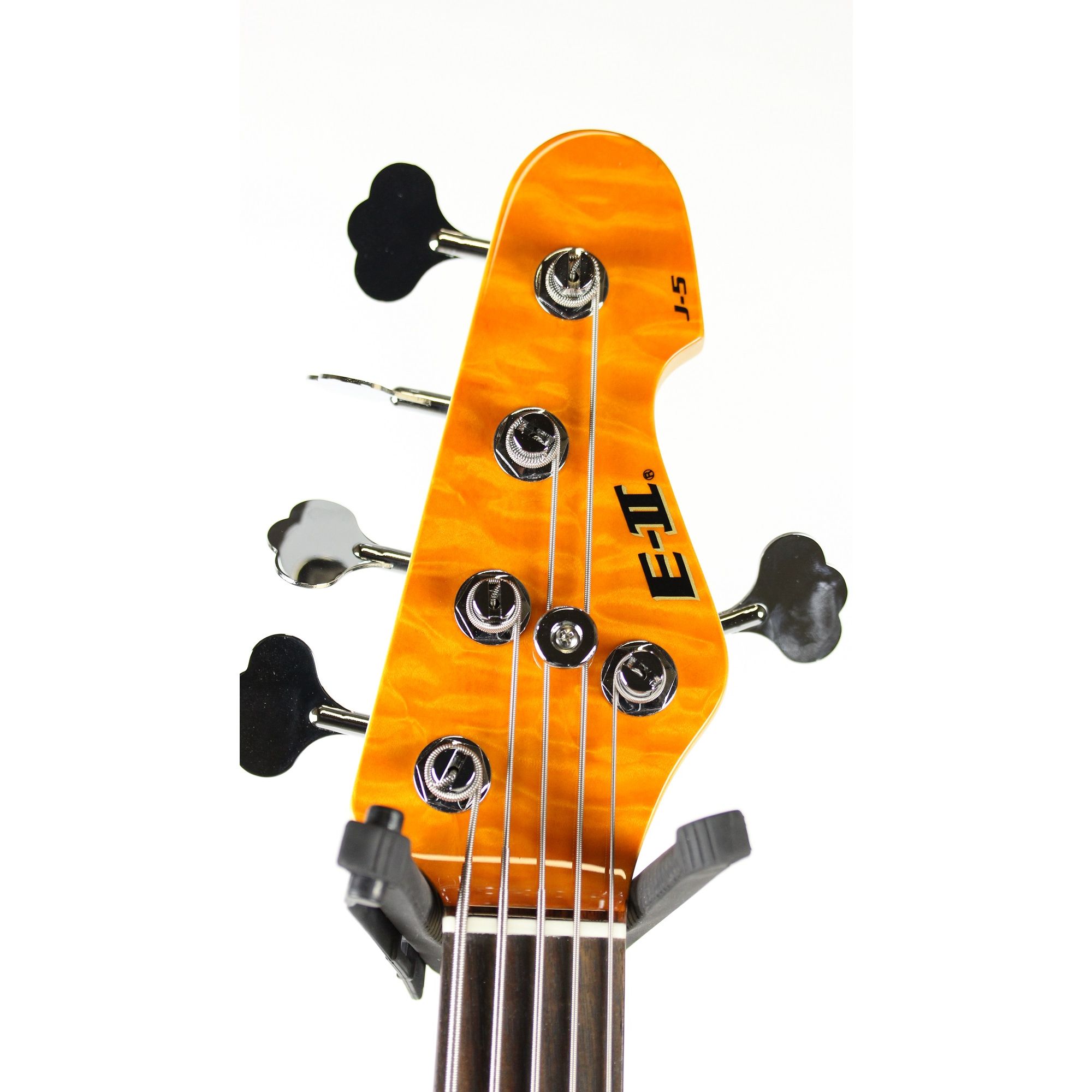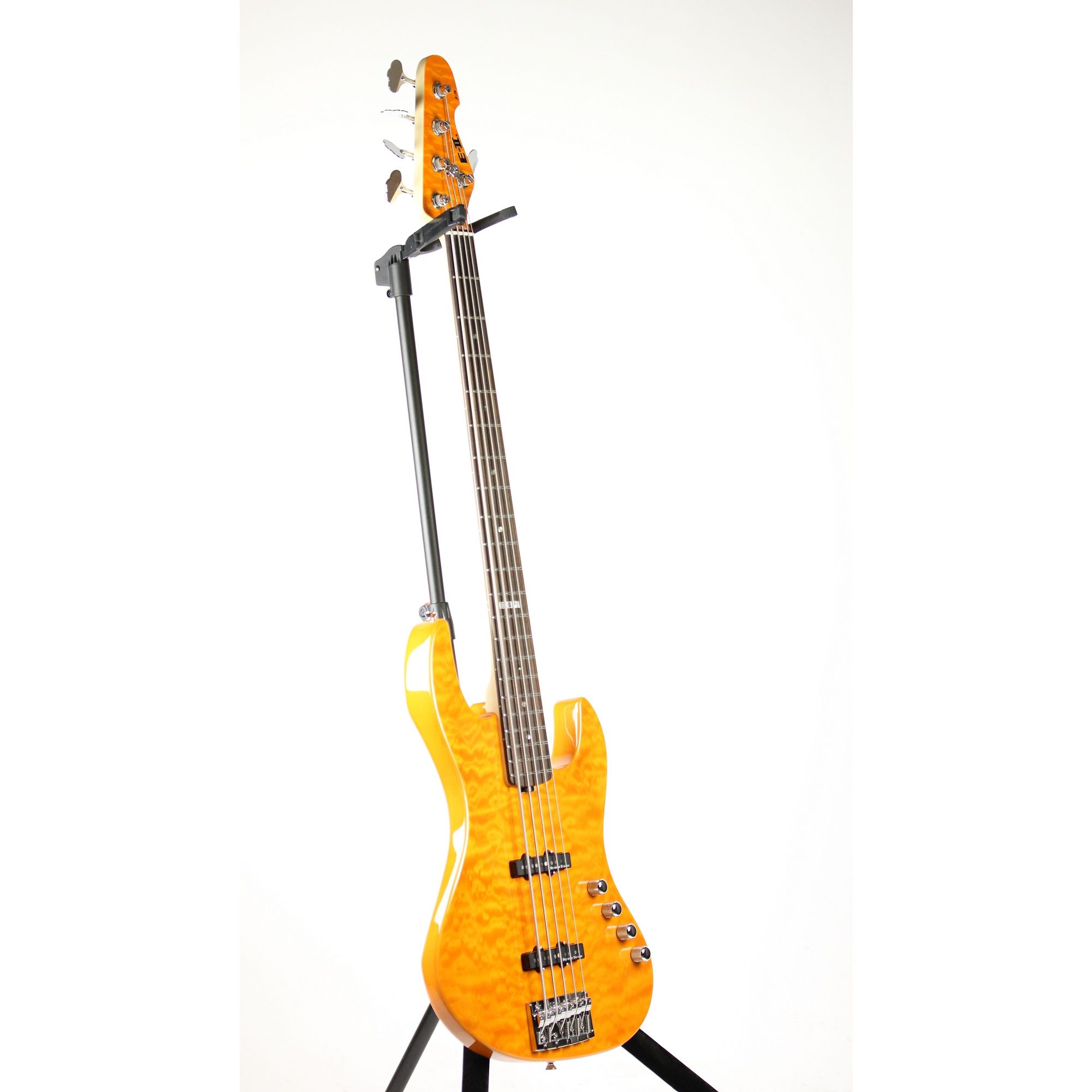 The new ESP E-II J-5 QM Quilted Maple Amber Bass Guitar features: