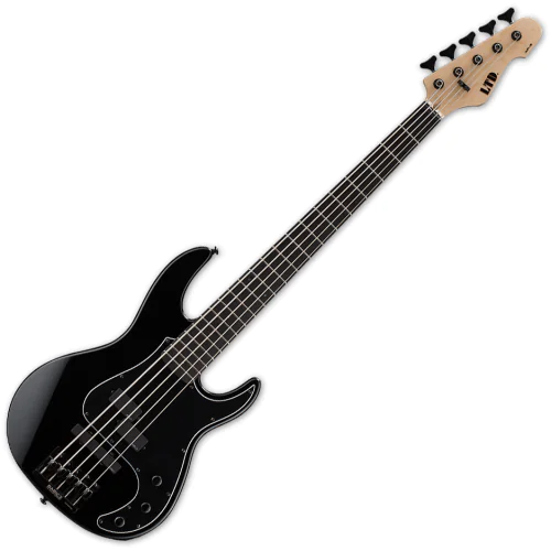 The ESP LTD AP-5 5-string electric bass features an alder body in black, maple neck with ebony fingerboard, EMG LJ5/P5 pickups, and a Babicz FCH-5 bridge.