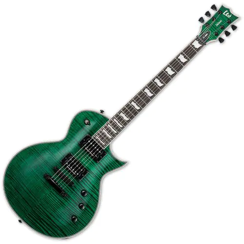 Guitars in the LTD EC-1000 Series are designed to offer the tone, feel, looks, and quality that working professional musicians need in an instrument. Available in exciting See Thru Purple and See Thru Green over an outstanding flamed maple top with binding on the body, neck, and matching headstock, this guitar features a Macassar ebony fingerboard with 24 extra-jumbo frets, and high-quality Seymour Duncan pickups along with other premier components like LTD locking tuners and a Tonepros locking TOM bridge and tailpiece. It also offers set-thru construction with a mahogany body and three-piece mahogany neck.
