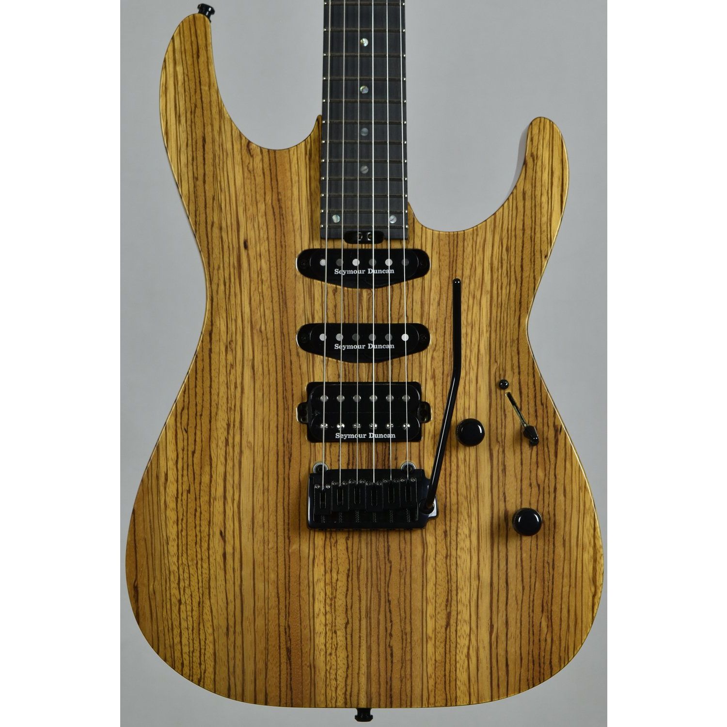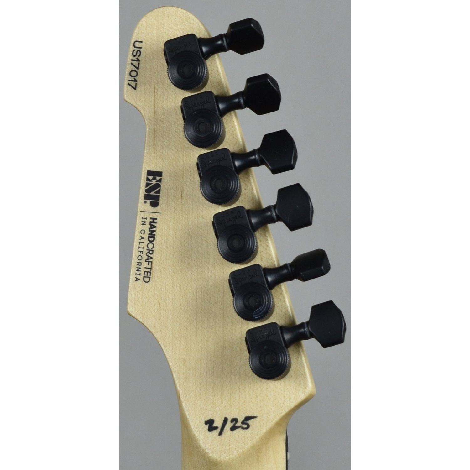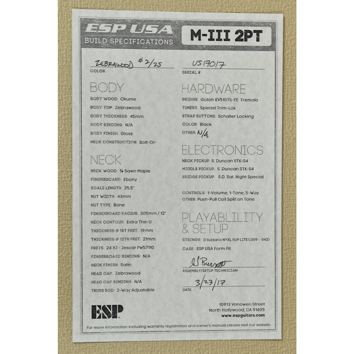 The ESP USA M-III 2PT electric guitar features an okoume body with zebrawood top, 1/4 sawn maple neck with ebony fingerboard, a pair of Seymour Duncan STK-S4/Saturday Night Special in bridge, and the Gotoh EV510TS-FE tremolo.