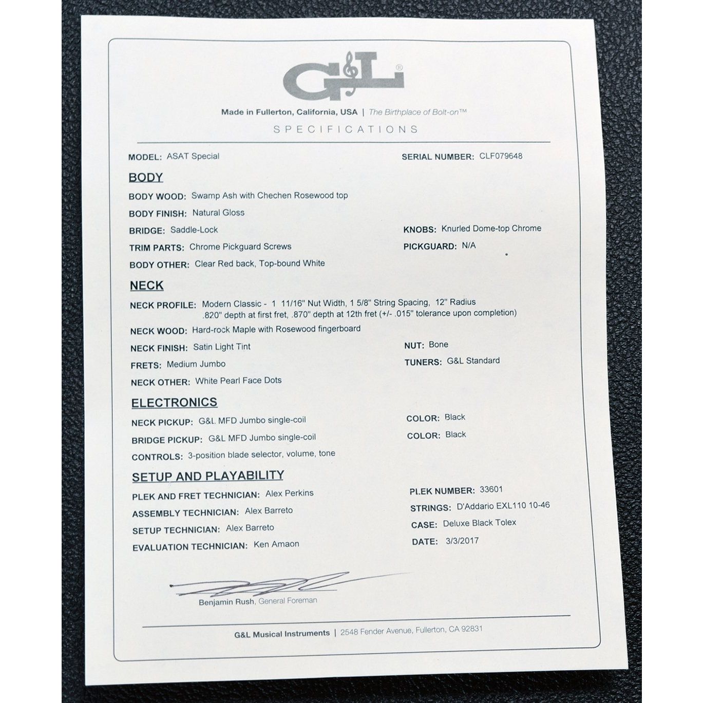 The G&L USA ASAT Special electric guitar features a Swamp Ash body with a Chechen Rosewood top in a natural gloss finish, hard-rock Maple neck with Rosewood fingerboard, and a pair of G&L MFD Jumbo single-coils.