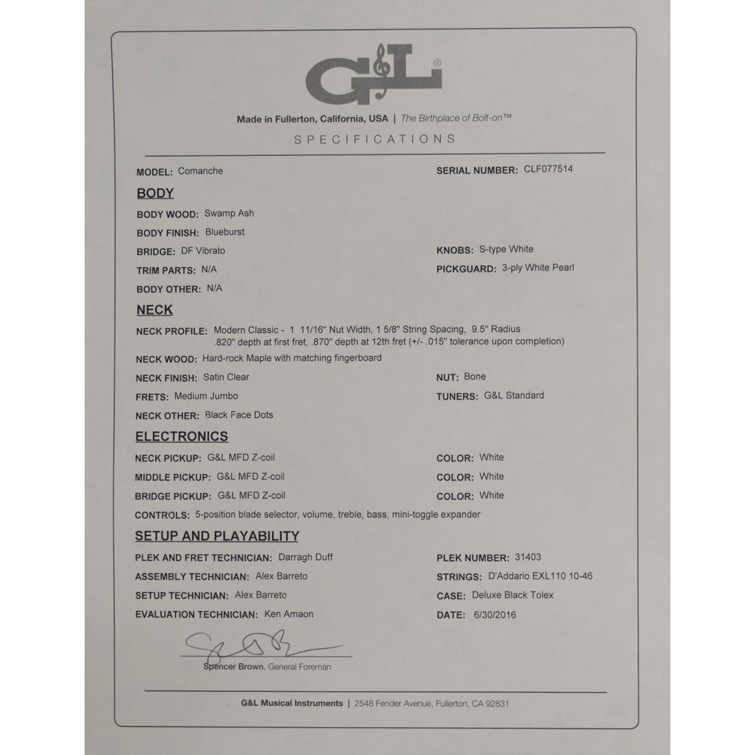 The G&L Comanche® is Leo's final word on the traditional double-cutaway bolt-on axe. Fact is,the first thing you'll notice about the Comanche is the distinctive shape of the Magnetic Field Design™ Z-Coil™ pickups designed by Leo Fender himself. These pickups deliver a bright and sparkly top end while offering a robust bottom end,all without any 60-cycle hum.