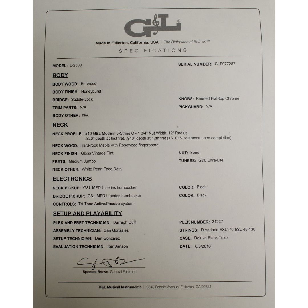 G&L usa custom L-2500 5 string empress body electric bass in honeyburst