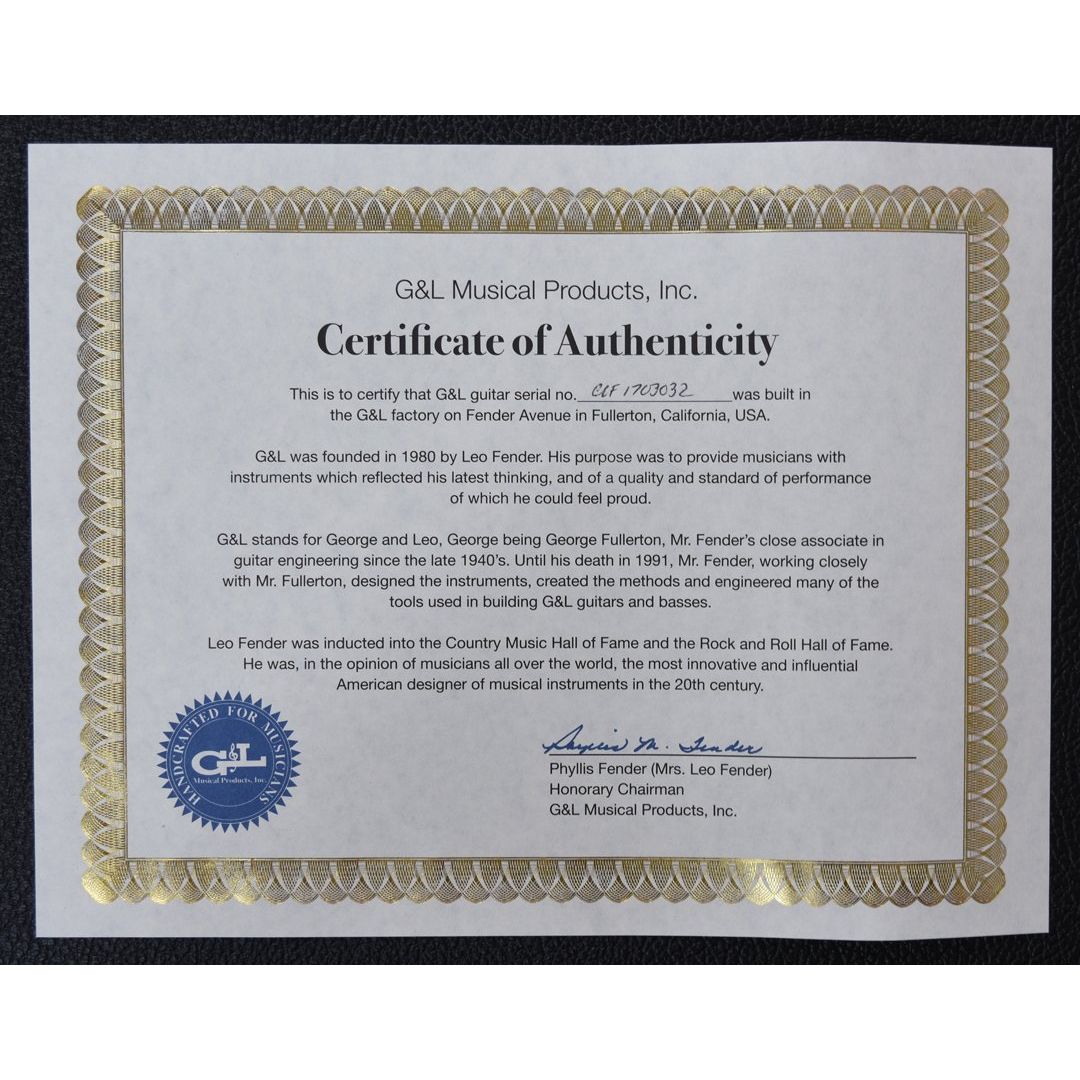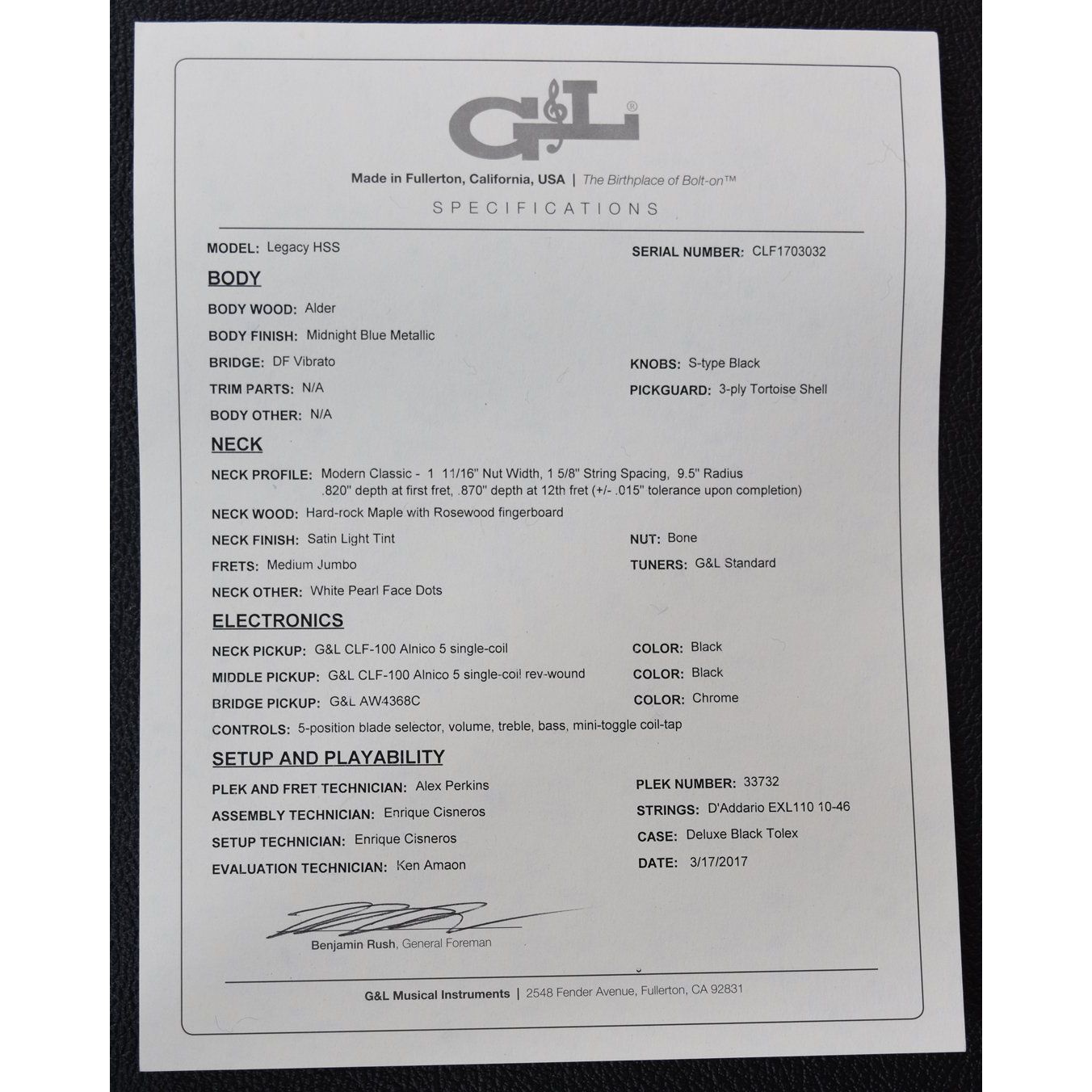 The G&L USA Legacy HSS electric guitar features an alder body, hard-rock maple neck with rosewood fingerboard, a set of G&L CLF-100 alnico 5 single-coils, reverse-wound in the middle, AW4368C in bridge, and a DF vibrato bridge.