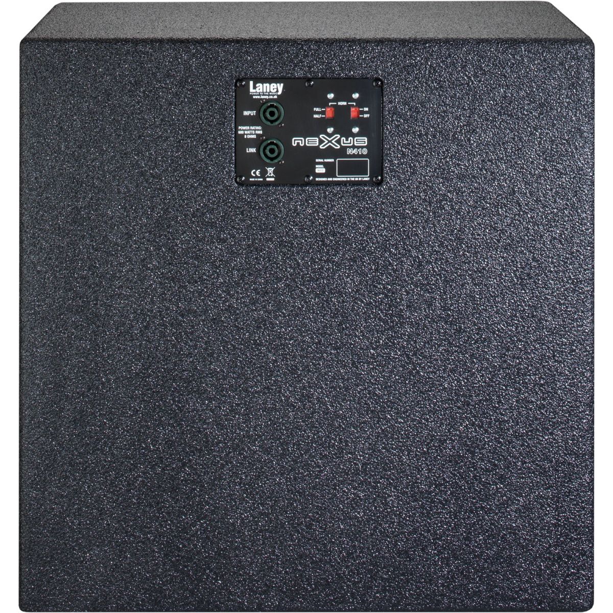 The NEXUS N410 cabinet is an ultra-light, high performance bass enclosure, loaded with neodymium drivers and finished in Laney's Tuffstuff coating, the NEXUS N410 has been designed to be used in conjunction with the NEXUS-SL and SLS bass head. The N410 is loaded with 4 x LaVoce neodymium 10” drivers plus a La Voce 1" exit compression driver which is switchable to on/off and half power settings. Selected exclusively for the NEXUS range, these Italian-designed speaker components are truly outstanding for bass. The lightweight, heavy duty, plywood cabinet is then finished in Laney's Tuffstuff: An incredibly tough, ultra-durable and resilient polyurethane coating designed to deal with the rigours of life on the road