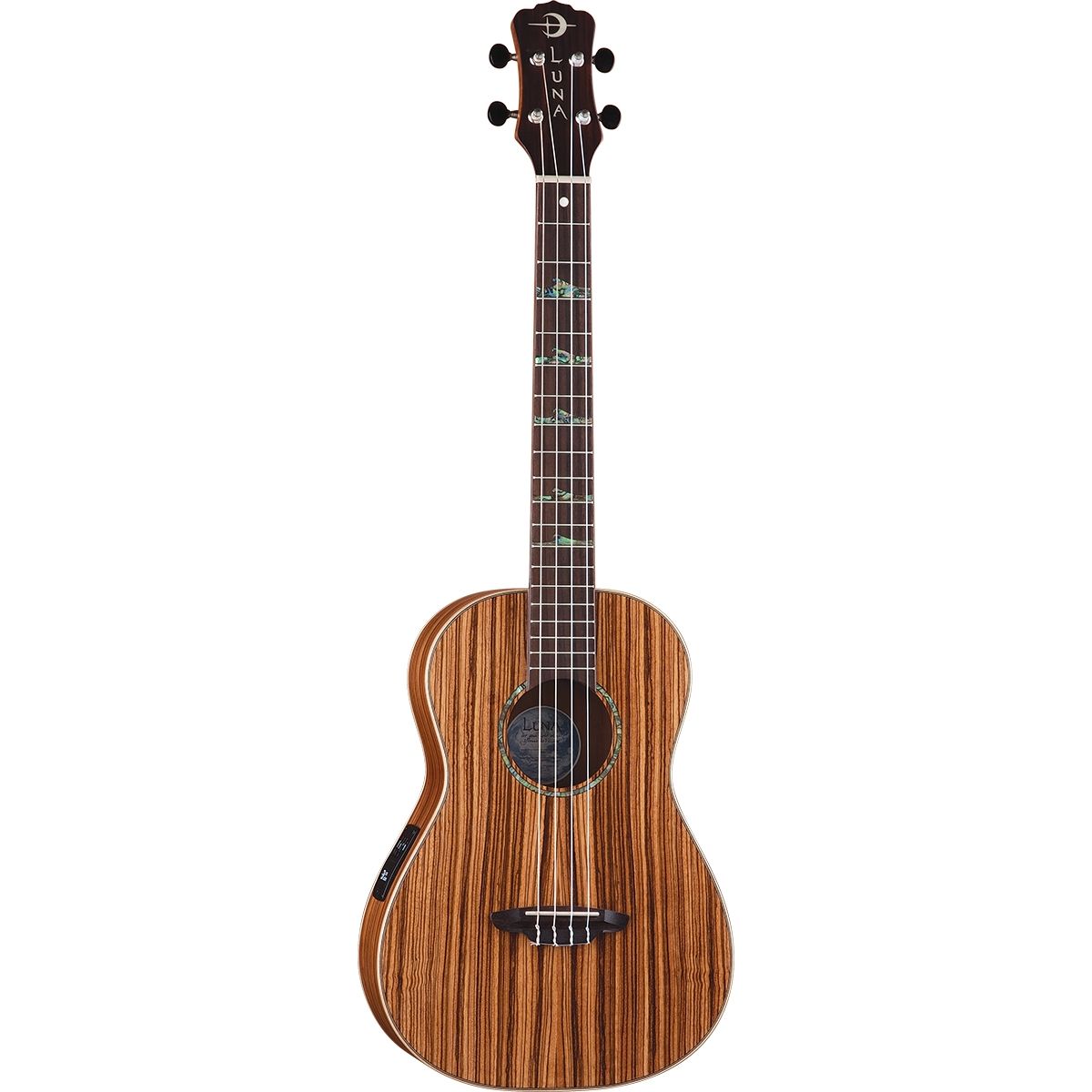 This beautiful Luna ukulele features a Zebrawood body, producing full, deep sound along with the instrument's baritone body size. Set-neck Mahogany construction and walnut bridge add lasting sustain and clarity to your tone. The open-style tuners keep the instrument in precise tuning and the onboard preamp provides easy amplification that can be dialed in quickly. Dressed in a satin finish and featuring a rosewood binding, this is a sunning instrument whose natural beauty and quality construction make it a great choice for a variety of players.