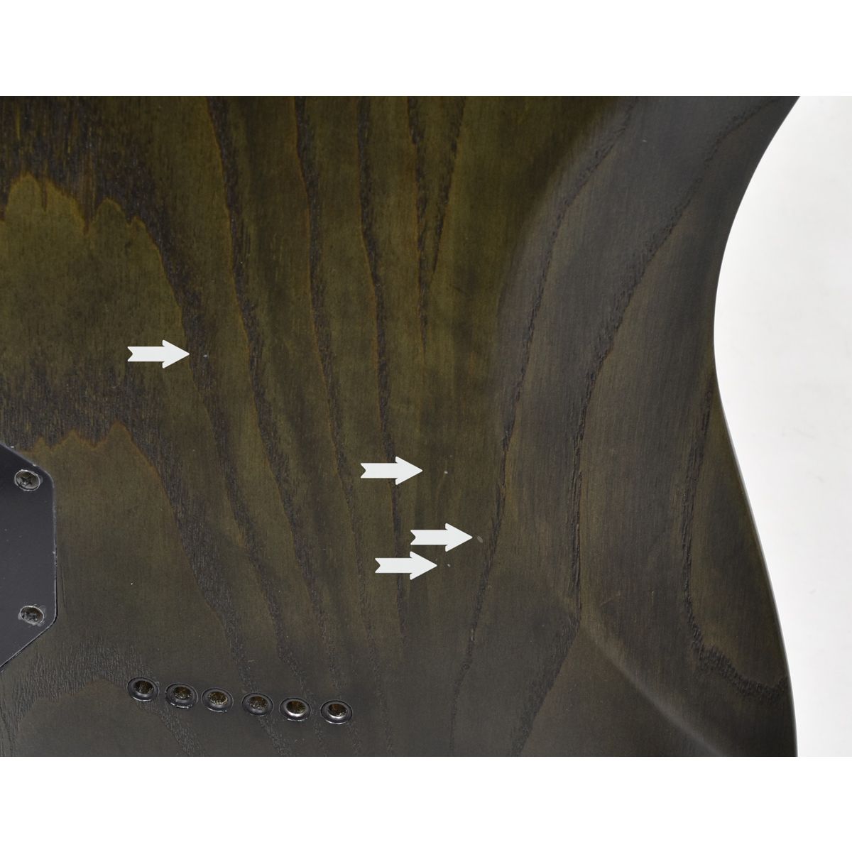 B-stock with delamination on back of body and small chip at edge of fretboard at last fret. see pictures.