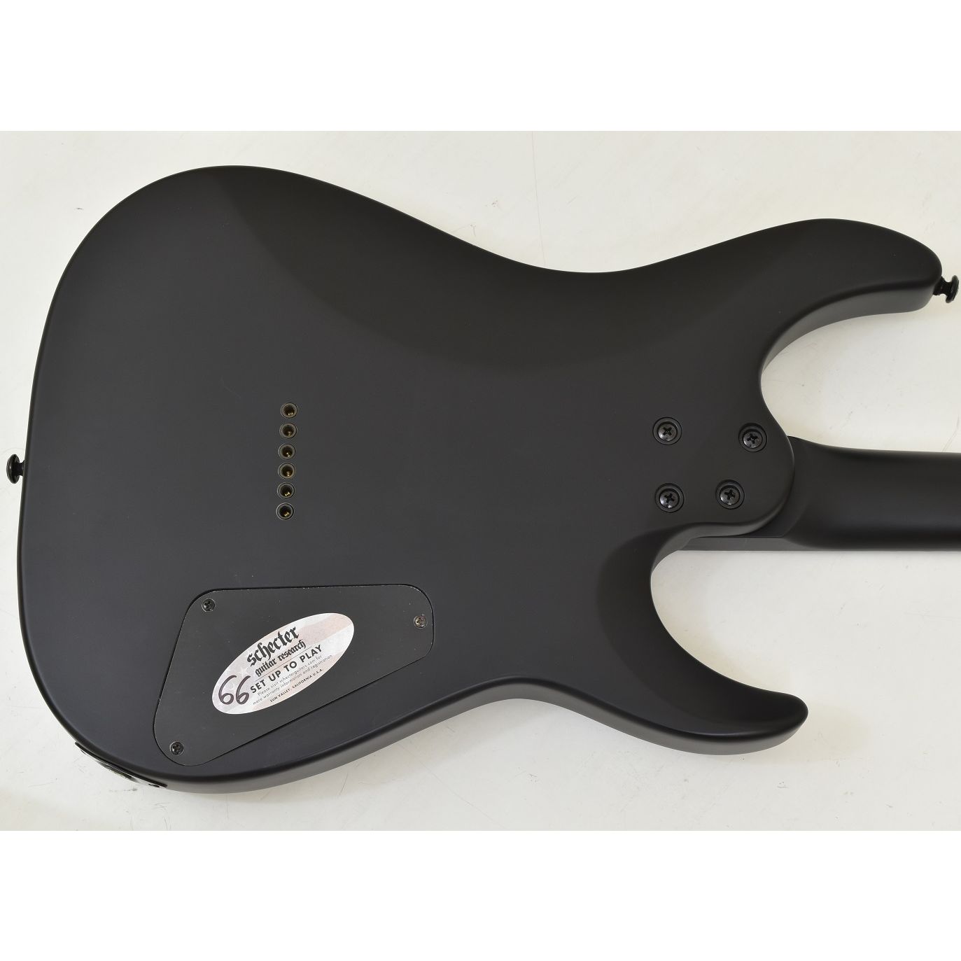 The body of the Damien-6 is crafted from mahogany, known for its rich, warm tones and sustain. It features an arched top and is bound with a single ply of black binding which outlines the guitar's sleek contours. This guitar is equipped with Schecter's custom hardtail bridge with string-thru body design, enhancing sustain and stability in tuning.