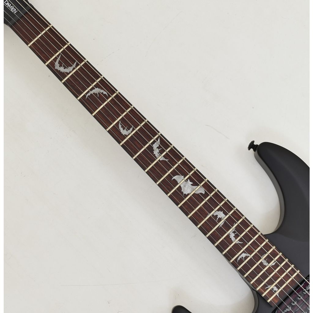 The guitar has a bolt-on neck construction, which provides a comfortable balance and easy access to the upper frets. The neck itself is made of maple, known for its bright tonal quality and excellent sustain. It's topped with a rosewood fretboard that offers a smooth playing experience, decorated with distinctive bat inlays that enhance the Damien-6's dark, thematic aesthetic. This model comes with 24 X-Jumbo frets on a 14-inch radius fretboard, facilitating effortless playability and string bending.
