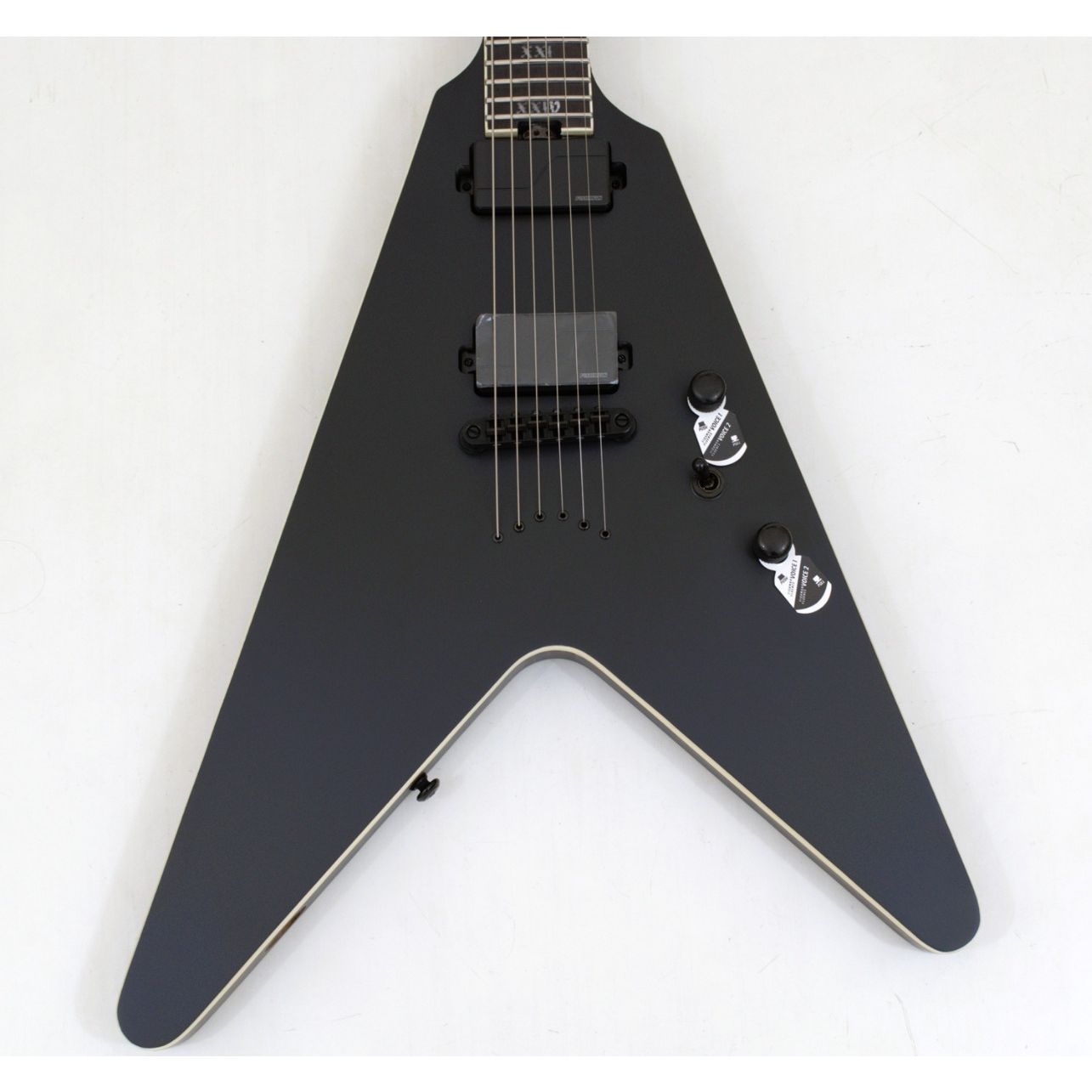 The Schecter V-1 SLS Elite Evil Twin in Satin Black is a bold V-shaped guitar built for modern metal players who demand speed, precision, and crushing tone. With its swamp ash body, neck-thru construction, and ultra-thin “C” neck reinforced with carbon fiber, this guitar offers maximum resonance, stability, and playability. Equipped with Fishman Fluence Modern humbuckers, it delivers an array of high-output tones with active versatility—perfect for heavy riffs, articulate cleans, and soaring leads. Stainless steel frets, glow-in-the-dark side dots, and Schecter locking tuners round out this fully stage-ready monster.