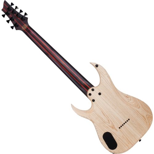 Hardware and Electronics: Tuning stability is provided by Hipshot Grip-Lock tuners, renowned for their reliability and precision. A Graph Tech Black Tusq XL nut specifically designed for 7-string guitars helps maintain consistent intonation. The Hipshot 7-String Fixed Bridge anchors the strings, providing stable tuning and enhanced sustain. The electronics feature a powerful duo of Schecter USA pickups: the Colossus 7 at the bridge for robust, articulate outputs, and the Chaosbreaker 7 at the neck for warmer, richer tones. The controls include a volume knob with push-pull functionality and a 3-way dependent toggle switch, offering a range of tonal options from clean to heavily distorted sounds.
