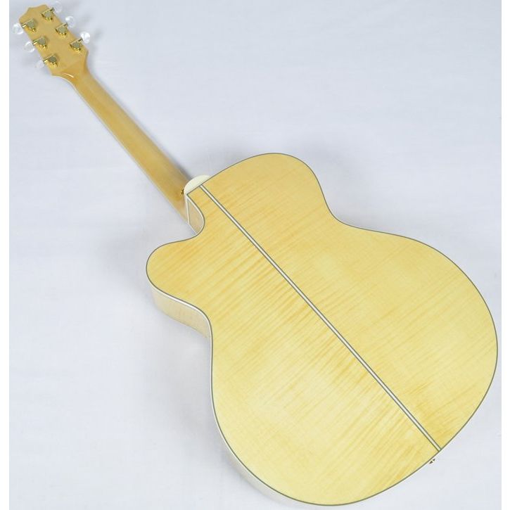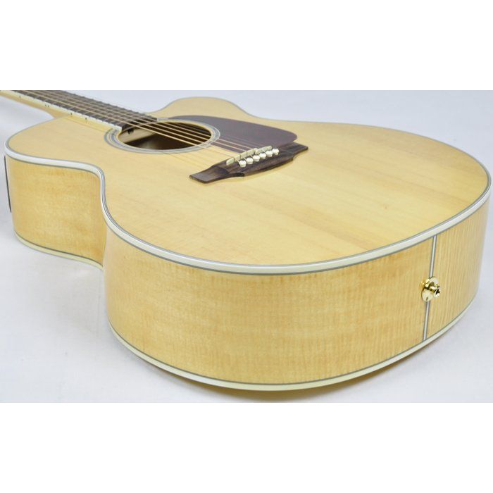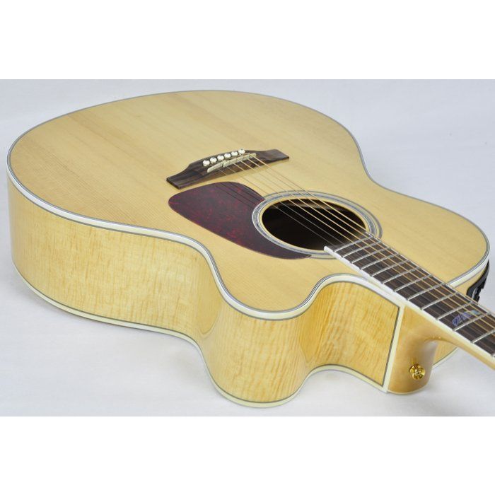 Featuring a solid spruce top and flame maple back and sides,the GJ72CE produces all the volume and robust sound that players expect from a jumbo guitar. The slim mahogany neck and 12”-radius bound rosewood fingerboard provide great feel and playability,while the onboard Takamine TK-40D preamp system gives you a built-in tuner,three-band EQ and gain controls,mid contour switch,notch filter and EQ bypass switch for the ultimate in versatility and sound quality.