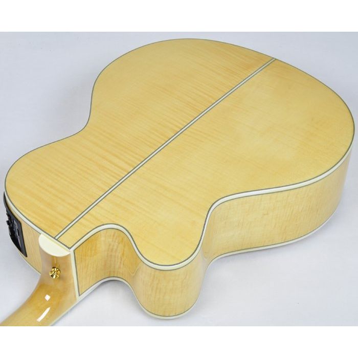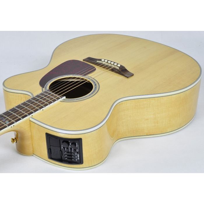 Other great features include a synthetic bone nut and split bridge saddle,rosewood headcap,abalone rosette,abalone "reversed mountain" inlay at the 12th fret,gold die-cast tuners with pearl buttons,and a beautiful gloss finish. Available in Natural and Sunburst.