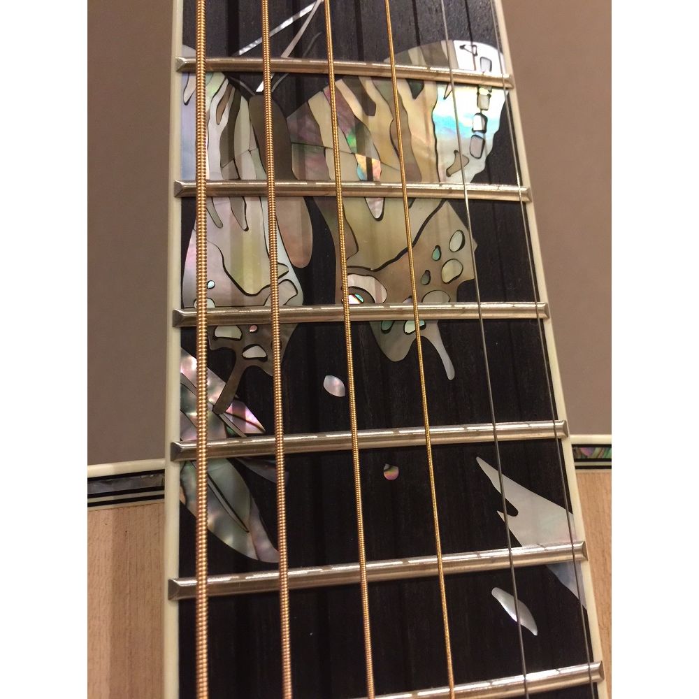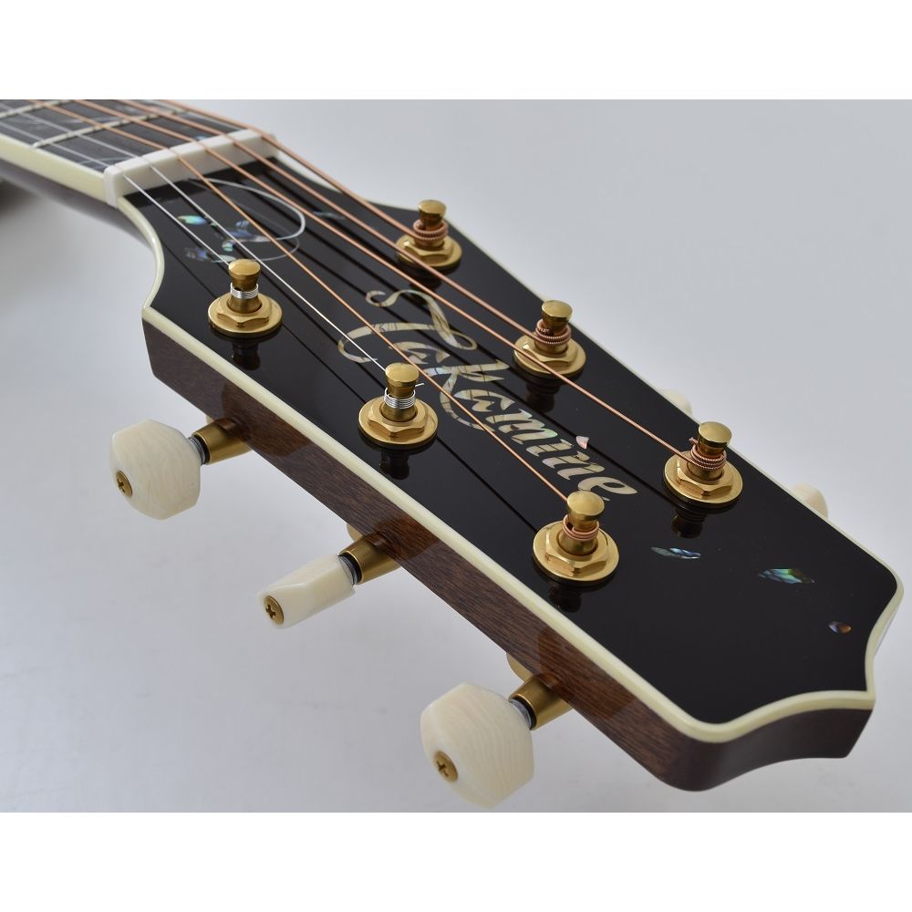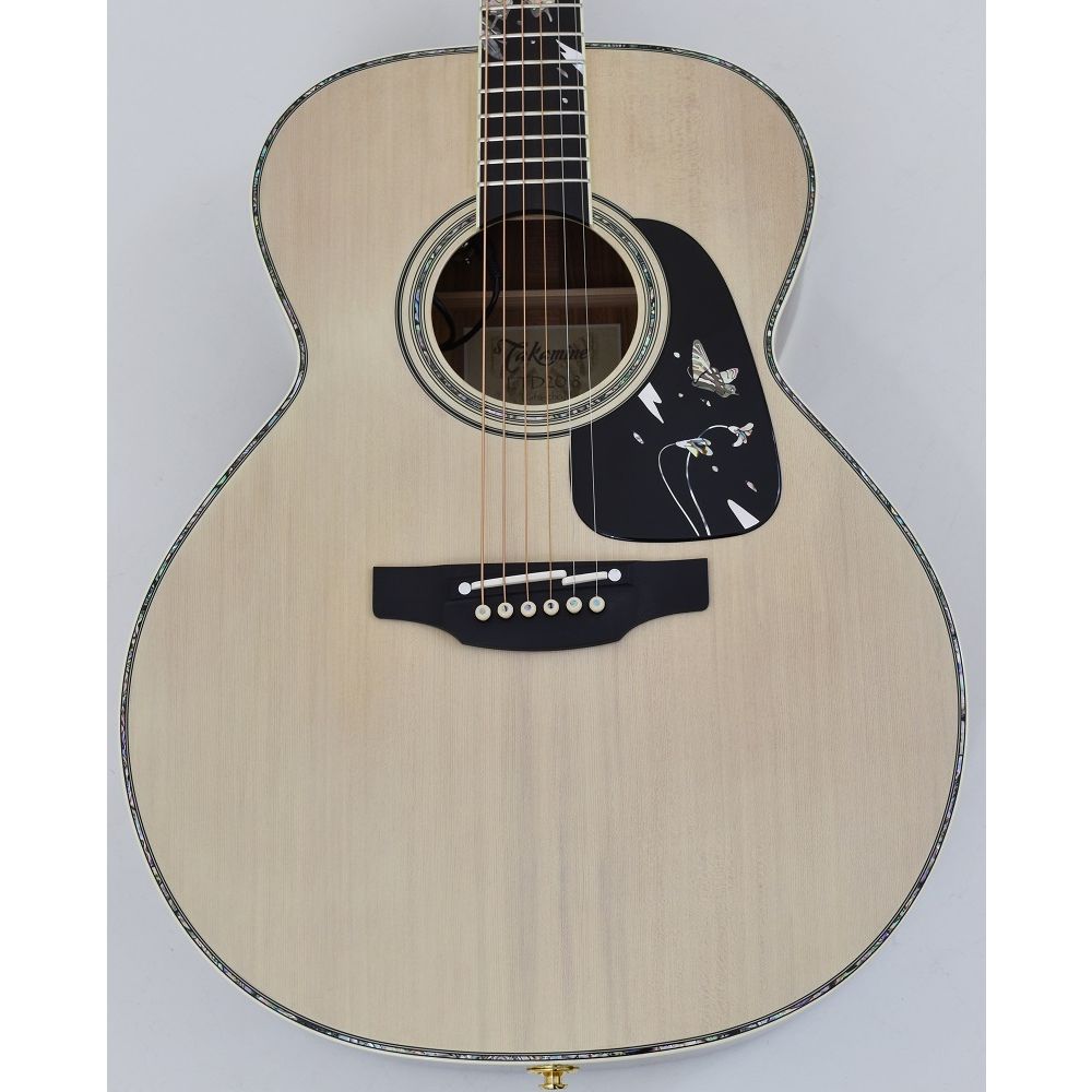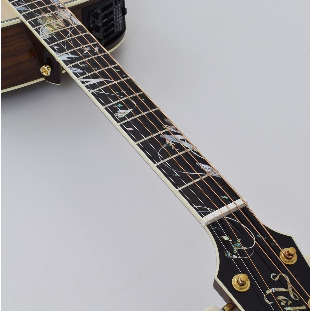 LTD-2018 Gifu-Cho is an NEX-sized acoustic-electric guitar with a solid cedar top and ovangkol back and sides. It features a mahogany neck with an ebony fingerboard and pick guard that are inlaid with a beautiful abalone “Gifu-Cho” motif. The guitar features Takamine’s renowned Palathetic pickup with a CTP-3 CoolTube preamp, a bone nut and saddle, abalone purfling and rosette, and gold tuning machines with ivoroid buttons. It has a unique "antique whitewash" treatment to the cedar top, along with ivoroid binding and a superb gloss natural finish. The LTD-2018 Gifu-Cho is shipped with a Certificate of Authenticity from Takamine.