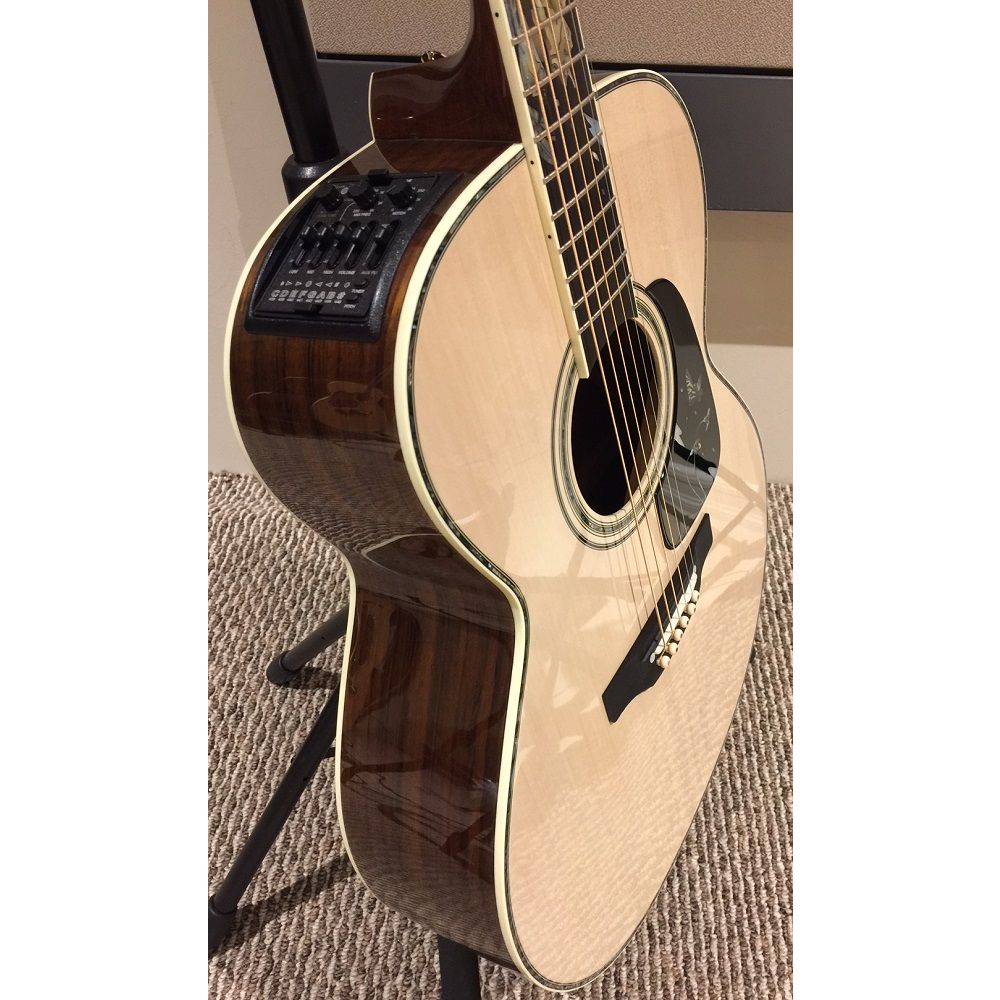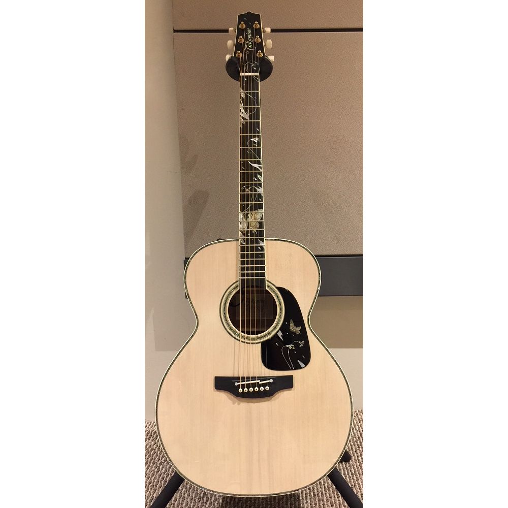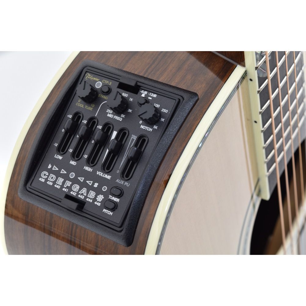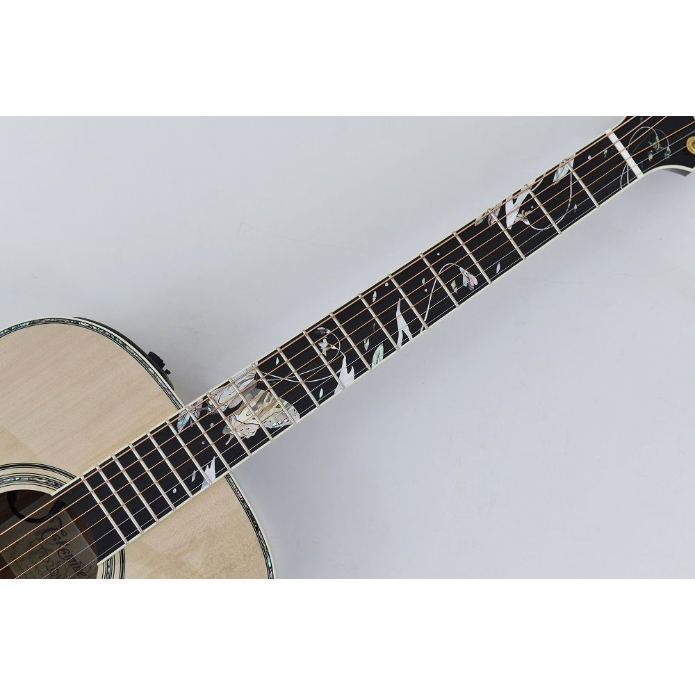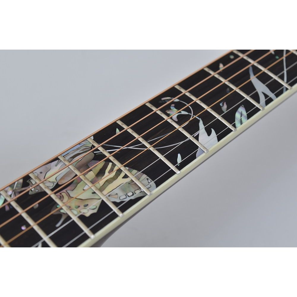 LTD-2018 Gifu-Cho is an NEX-sized acoustic-electric guitar with a solid cedar top and ovangkol back and sides. It features a mahogany neck with an ebony fingerboard and pick guard that are inlaid with a beautiful abalone “Gifu-Cho” motif. The guitar features Takamine’s renowned Palathetic pickup with a CTP-3 CoolTube preamp, a bone nut and saddle, abalone purfling and rosette, and gold tuning machines with ivoroid buttons. It has a unique "antique whitewash" treatment to the cedar top, along with ivoroid binding and a superb gloss natural finish. The LTD-2018 Gifu-Cho is shipped with a Certificate of Authenticity from Takamine.