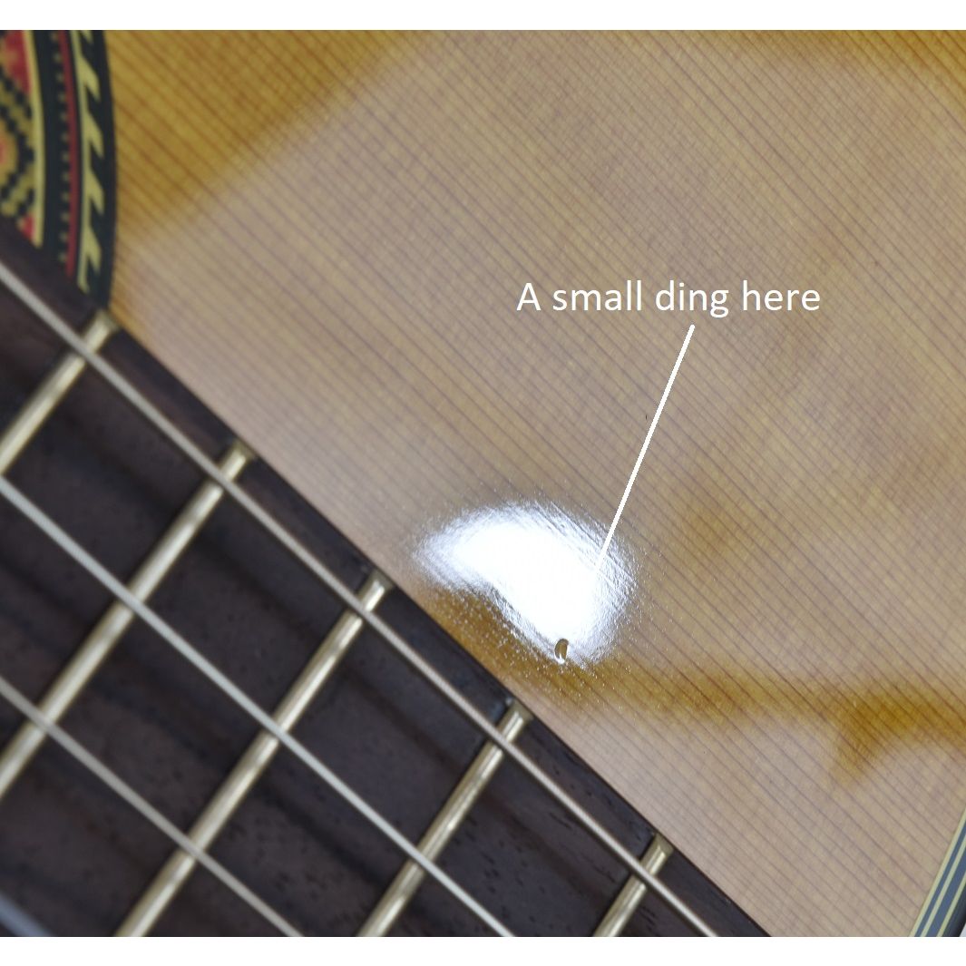 This B-stock Takamine TC132SC Classical Acoustic Electric guitar is unplayed and in excellent condition! There are a couple of dents on the body and a small ding on the neck heel. Please see the close-up pictures for more detail. Great buy on a beautiful guitar!